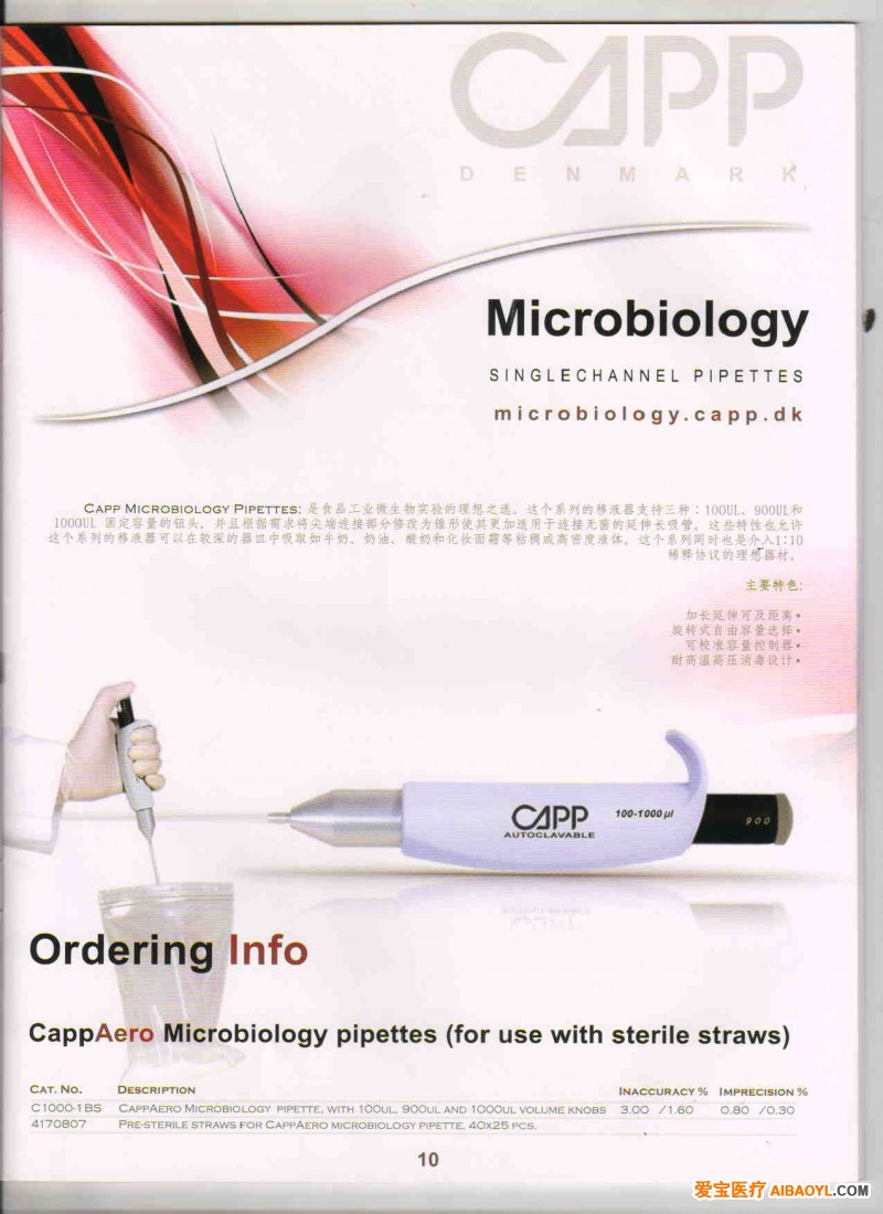 CAPP MICROBIOLOGY PIPETTES 是食品工业微生物实验的理想之选。这个系列的移液器支持三种:100UL、900UL和1000UL 固定容量的钮头,并且根据需求将尖端连接部分修改为锥形使其更加适用于连接无菌的延伸长吸管。这些特性也允许这个系列的移液器可以在较深的器皿中吸取如牛 奶、奶油、酸奶和化妆面霜等粘稠或高密度液体。这个系列同时也是介入1:10稀释协议的理想器材。