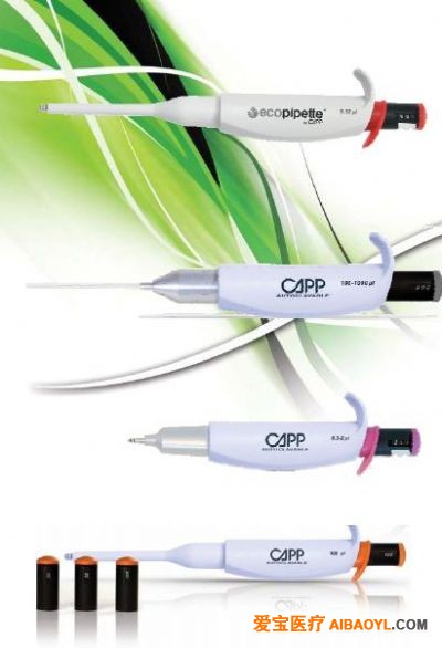 特制的移液器 CAPP PCR 移液器: CAPP PCR系列的构造是为PCR应用所特制的移液器。这个系列设计短小包括三种容量选择:0.2-2UL, 0.5-10UL 和2-20UL。因此这个系列为操作极小容量的样品提供了更精确的操作。这三款容量移液器都为适用10UL吸嘴而设计,这样所需要的排气量就远远小于适用 200UL吸嘴的移液器,所以准确度和精确度更高。