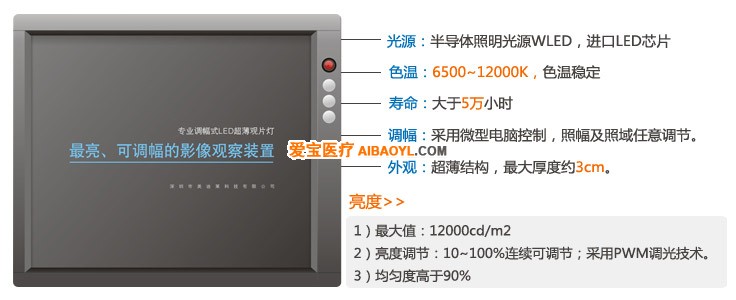 2.亮度最高。根据产品型号的不同,亮度可达为12000cd/m2,最大亮度可使胶片上的信息得到充分显示,为提高诊断质量提供了有力的保证。