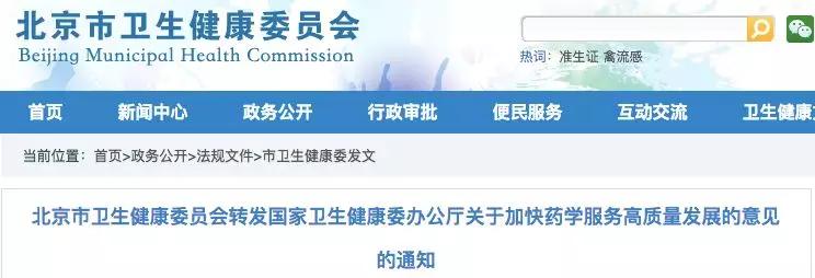 近日,北京市卫健委发布了《转发国家卫生健康委办公厅关于加快药学服务高质量发展的意见的通知》。
