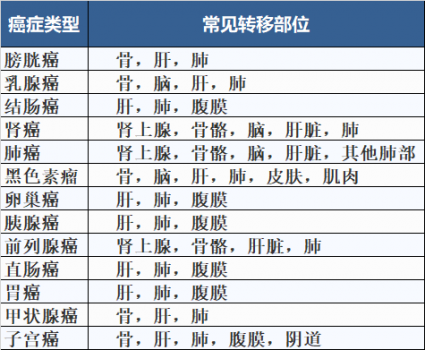 不同癌症转移的常见部位