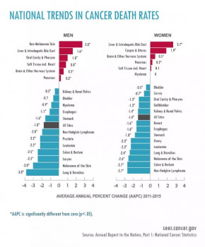 在美国,自20世纪90年代以来,死于癌症的数字已经稳步下降。一些癌症(如乳腺癌,前列腺癌和甲状腺癌)的五年存活率现在为90%或更高。目前所有癌症的5年生存率约为67%。