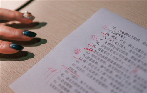 黄珊珊在配音台词上做的笔记,对于演员来说,有现场环境以及其他演员让自己入戏,而配音演员就要靠自己想象场景。有时一段几分钟的台词可能要录上两三个小时。虽然在配音领域做得很专业,但黄珊珊并非是播音主持专业出身的。在大学读英语专业的她偶然报名参加了电台举办的主持人大赛。凭借开朗的性格和爱说爱笑的特质,黄珊珊竟然在众多科班出身的选手中拿到第四名。那时还没毕业的她有机会踏入电台工作,勤奋加上天赋,不久后还被引荐做音乐DJ,拥有属于自己的音乐节目。做音乐节目让她积累不少明星资源,两年后黄珊珊便和朋友到北京创业开了一家艺人经纪公司,从女学生摇身变成了女老板。