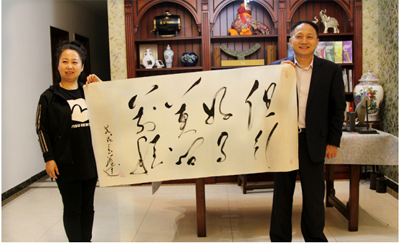 张源达博士后(右)现场书写“但行好事 莫问前程”赠予李秀岩总裁(左)