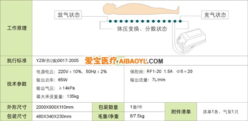 鱼跃条纹式防褥疮床垫由床垫和气泵两部分组成,在气泵内增设配气机构,以每项10分钟的交换频率驱动两组气路