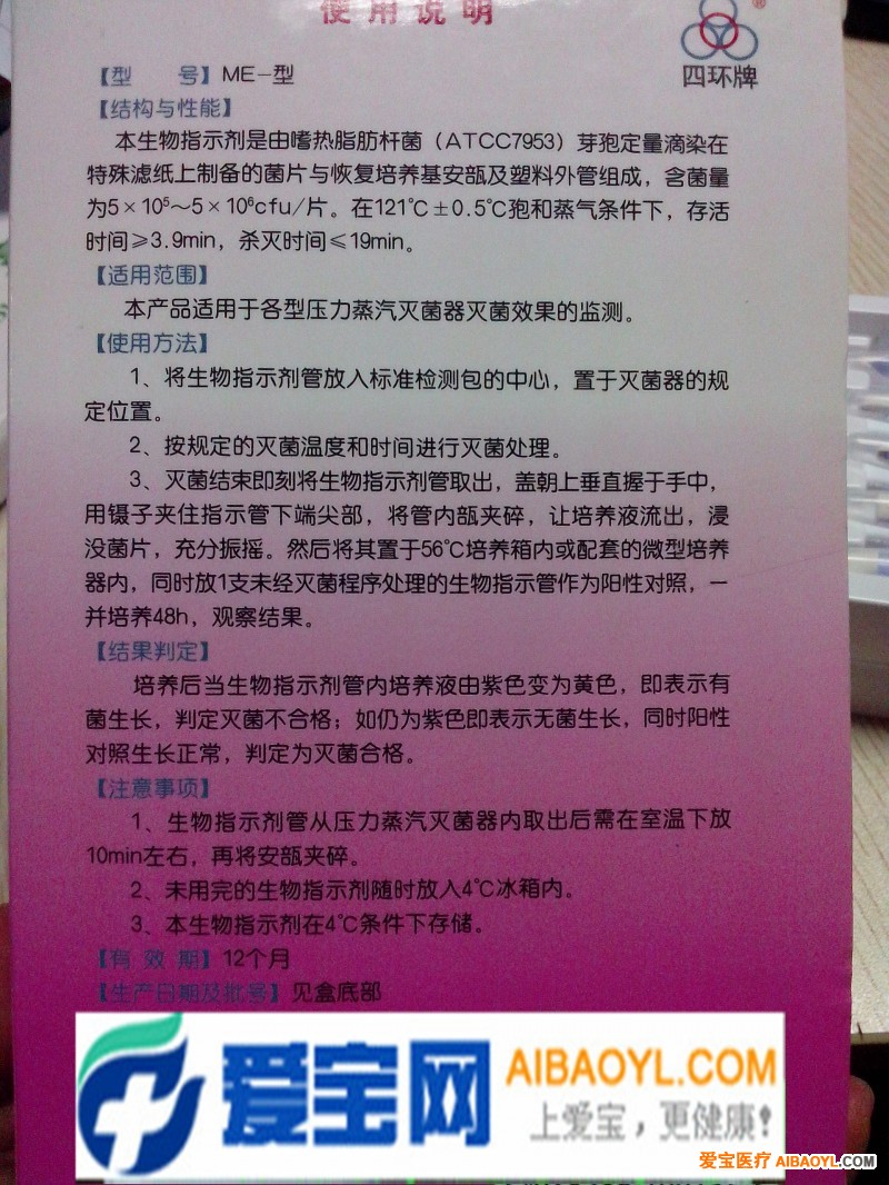 四环牌 ME-压力蒸汽灭菌生物指示剂是由嗜热指肪杆菌(ATCC 7953)芽孢菌片、恢复培养基和外管组成。菌片含菌量为5.0×105 ~5.0×106 cfu/片。生物指示剂的抗力符合国际标准和国家标准的规定:既在121℃饱和蒸汽作用下,存活时间≥3.9min,杀灭时间≤19min,D 10 值1.3~1.9min。